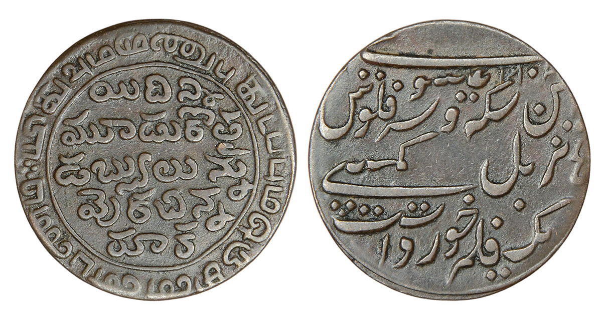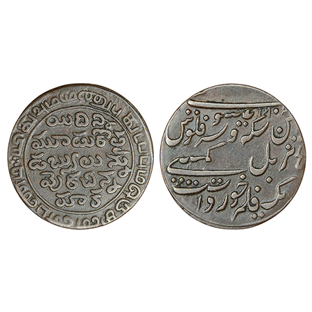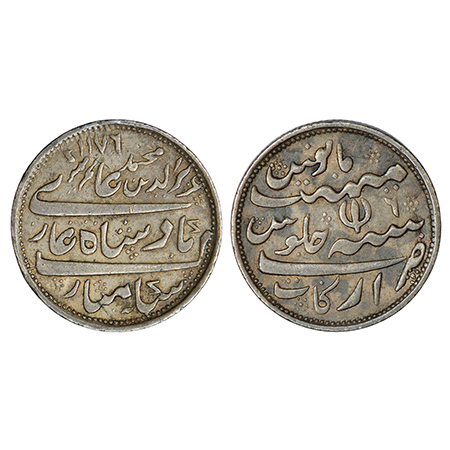 These are derived from the earlier crescent marked rupees struck at Bombay or Tellicherry. Distinguishing features are the upside-down crescent, the simplified legend and the neat appearance of the coin.