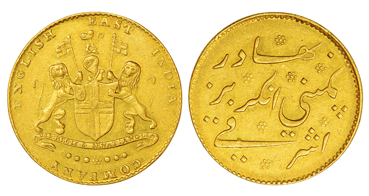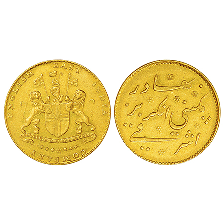 Madras Presidency, Madras mint, later coinage, gold ashrafi, ND (1819), edge grained straight, Stevens EIC 4.4; PR 241, 11.62g. Obv: Coat of arms of East India Company. Rev: Persian legend Ashrafi Kampani Angrez Bahadur.