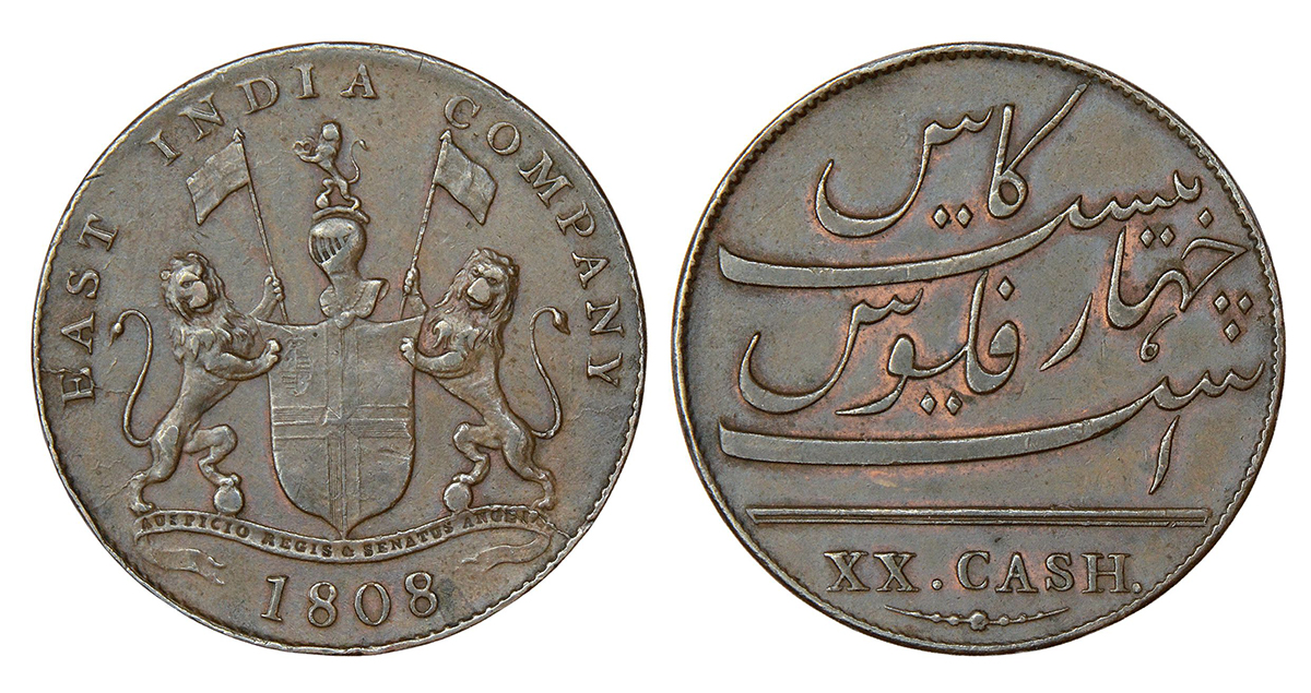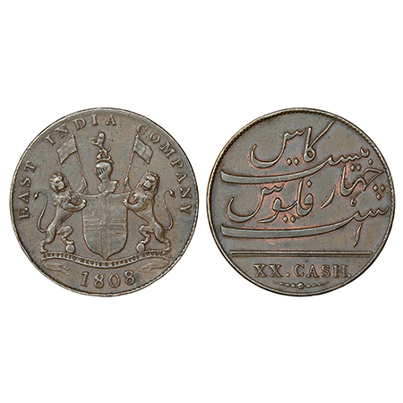 Madras Presidency, Soho mint, copper 20 cash, AD 1808 (last digit 8 struck over 7), Stevens EIC 5.121, 9.49g. Obv: East India Company coat of arms, date below. Rev: Value in Persian and English.