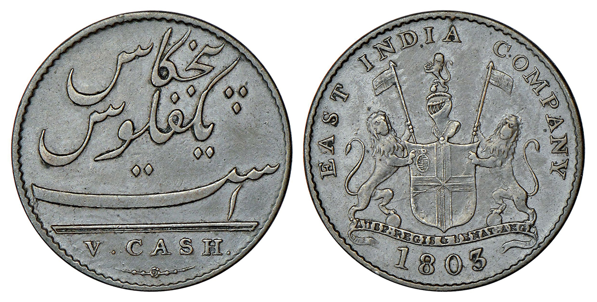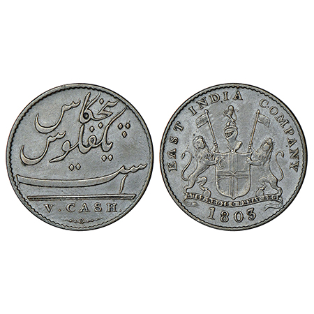 Madras Presidency, Soho mint, copper 5 cash, AD 1803, Stevens EIC 5.139; PR 208, 2.98g. Obv: East India Company coat of arms. Rev: Value in Persian and English.