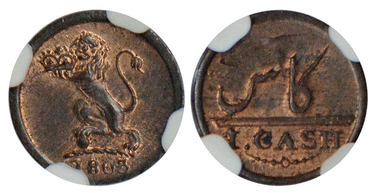 Madras Presidency, Soho mint, copper cash, AD 1803, Stevens EIC 5.148; PR 212. Obv: Lion holding a crown facing to left, with date below. Rev: Value in English and Persian.
