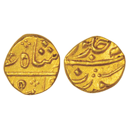 Bengal Presidency, Murshidabad mint, gold mohur, in the name of Shah Alam II, AH 1202/RY 19, edge grained left, Stevens EIC 6.7; PR 83, 12.35g. Obv: Persian legend Sikka zad bar haft kishwar saya fazl elah hami din Muhammad Shah Alam Badshah and AH date. Rev: Persian legend Sanah 19; zarb Murshidabad.