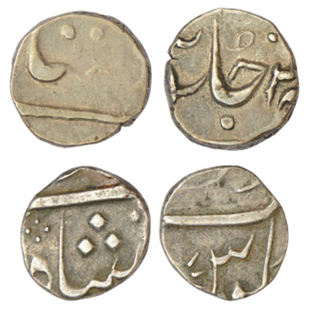 Bombay Presidency, Surat mint, silver coins (2), in the name of Shah Alam II. (A) ¼ rupee, RY 4x, Stevens EIC 6.172, 2.85g. (B) 1/8 rupee, privy mark 1, Stevens EIC 6.173, 1.42g.