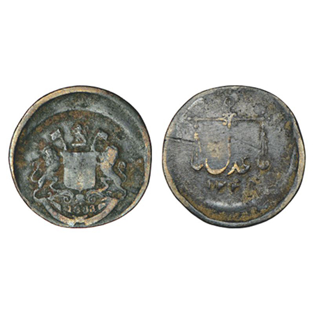 Bombay Presidency, Bombay mint, error copper pie, AD 1833/AH 1248, Stevens EIC 5.39/5.41; PR 222/224, 1.99g. Obv: East India Company coat of arms. Rev: Scales and Persian 'Adil', AH date below.