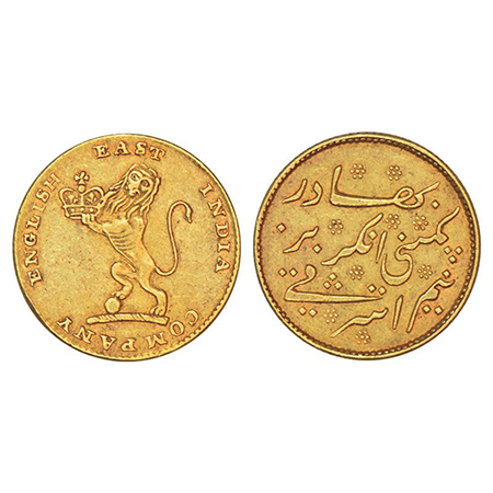 Madras Presidency, Madras mint, later coinage, gold ½ ashrafi, ND (1819), edge grained straight, Stevens EIC 4.5; PR 242, 5.82g. Obv: Lion holding a crest of company; legend around. Rev: Persian legend Nim Ashrafi Kampani Angrez Bahadur.