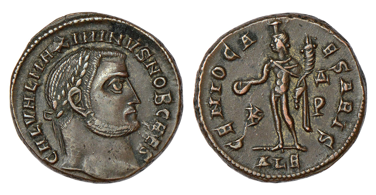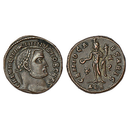 Roman Empire - nummus/ folis of Maximinus II (311-313 AD), Alexandria mint, RIC VI 100, 7.87g. Obv: Head of Maximinus II right, laureate; Latin legend GAL VAL MAXIMINUS NOB CAES around. Rev: Genius standing left, nude, kalathos on head, pouring liquor from patera in right hand, cornucopia in left hand; Letter in left field. Officina over letter in right field, Latin legend GENIO CAESARIS K - P and mintmark ALE in exergue.