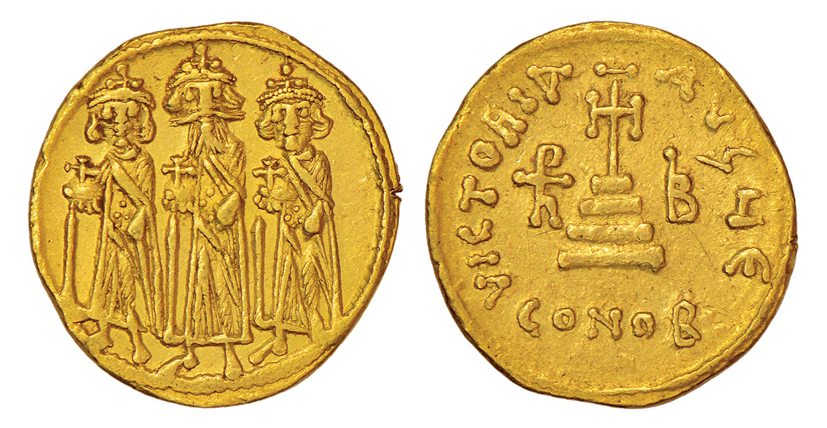 Eastern Roman Empire - gold solidus of Heraclius, with Heraclius Constantine, and Heraclonas (AD 632-641) Constantinople mint, 5th officina, ca. AD 632-635, Sear 758, 4.44g. Obv: Heraclius (in center), with long beard and mustache, Heraclius Constantine (on right), beardless, and Heraclonas (on left), beardless and smaller, all standing facing, Heraclius and Heraclius Constantine each wearing crown surmounted by cross, Heraclonas uncrowned in plain cap, all wearing chlamys, with globus cruciger in right hand. Rev: cross potent on four steps with Latin legend VICTORIA AVG HE; complex monogram in left field, letter B to right and CONOB in exergue.