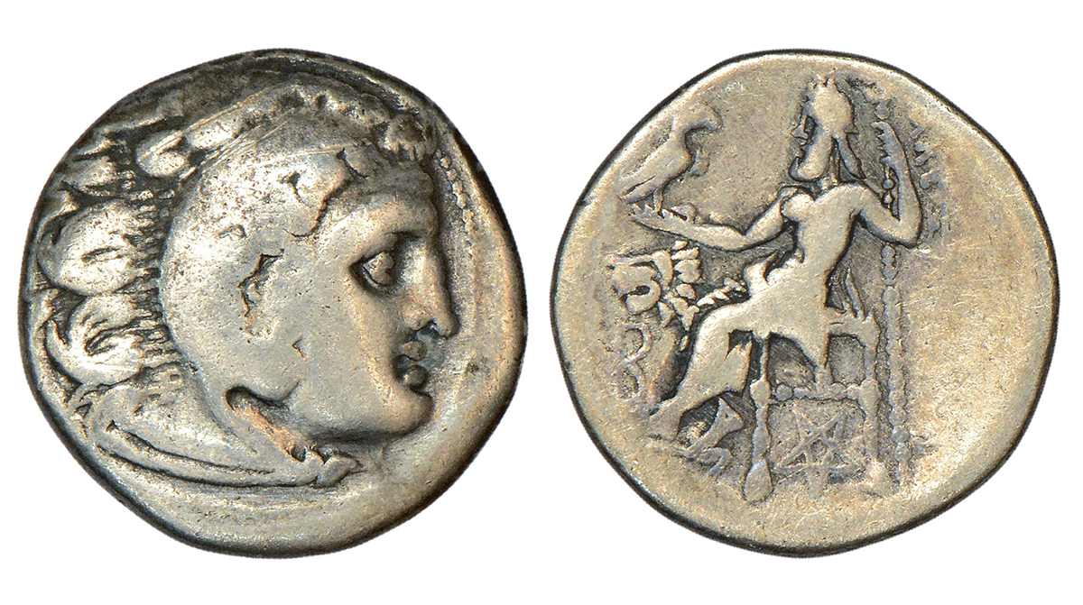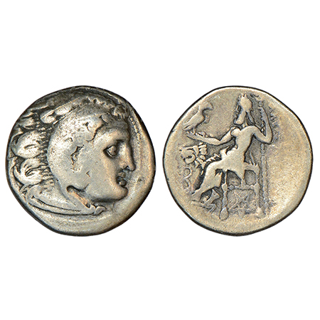 Kingdom of Macedonia, Alexander III 'the Great' (c. 336-323 BC), silver drachm, 3.92g. Obv: Head of young Herakles right in lion skin headdress. Rev: Zeus enthroned left, holding long scepter in his left hand and eagle standing right with closed wings in his right hand, monogram in left field; lion's head to left above monogram; below throne, star monogram.