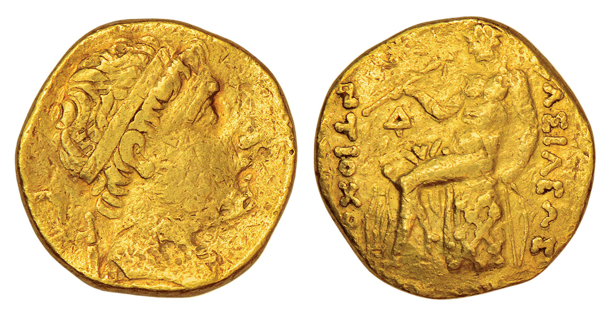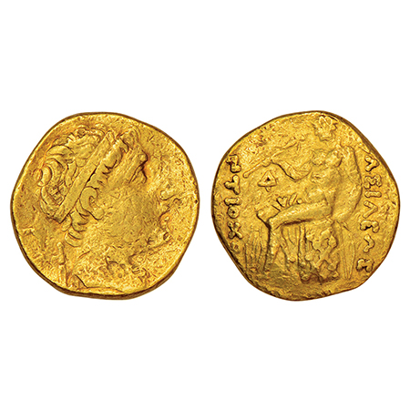 Ancient Greece, Seleukid Kingdom, imitation of gold stater of Antiochus I Soter, (c.266-261 BC), 8.02g. Obv: Diademed head to right. Rev: Apollo, seated to left, testing arrow in his right hand, left hand holding tip of bow set on ground to right, Δ to inner left, legend BAΣIΛEΩΣ / ANTIOXOY on either sides.