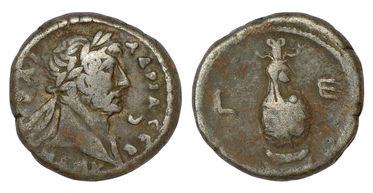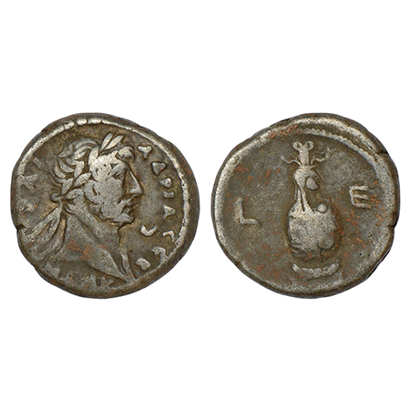 Egypt, Alexandria - Roman provincial coin of Hadrian (117-138AD), billon tetradrachm, dated RY 6 (AD 121/2), RPC III 5312, 12.48g. Obv: Laureate bust right, draped left shoulder, crescent moon to right; Greek legend ADRIA CEB. Rev: Canopic jar of Osiris to right; L E (date) across field.