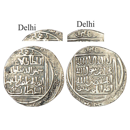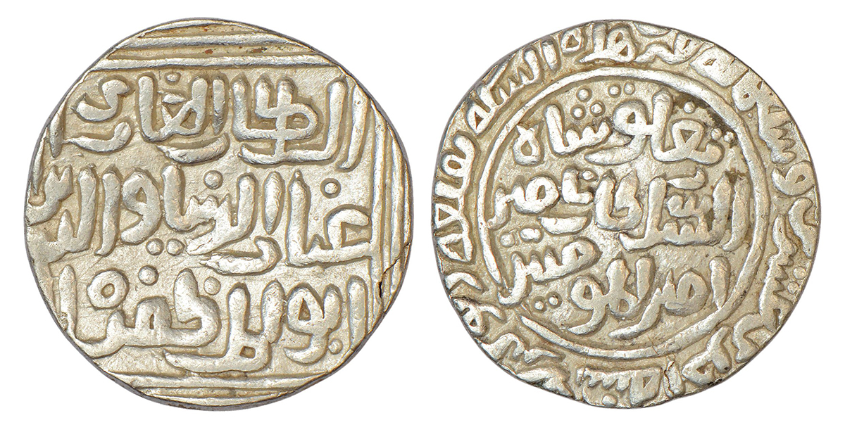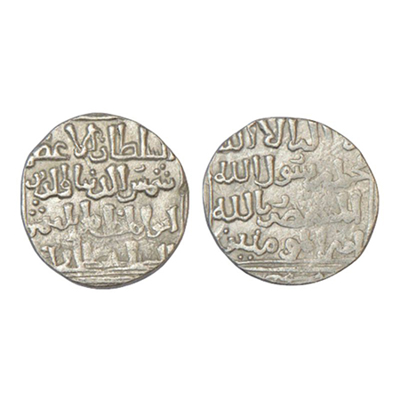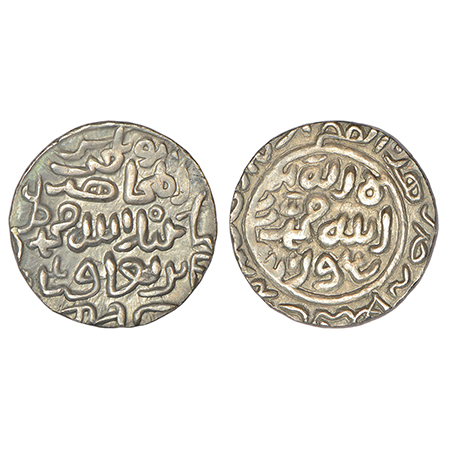 Sultans of Delhi, Turks, silver tanka of Shams al-Din Iltutmish (1210-1235 AD), Delhi mint, citing Caliph al-Mustansir, mint-name inscribed at top on both sides, variety unlisted in G&G, similar to G&G D34, 10.93g. Obv: Arabic legend al-sultān al 'azam shams al-duniyā wa al-din abu al-muzaffar iltutmish al-sultān in double rectangles with mint-name Delhi above. Rev: Shahada followed by Arabic legend al-mustansir billah amir al-mumineen in double rectangles with mint-name Delhi above.