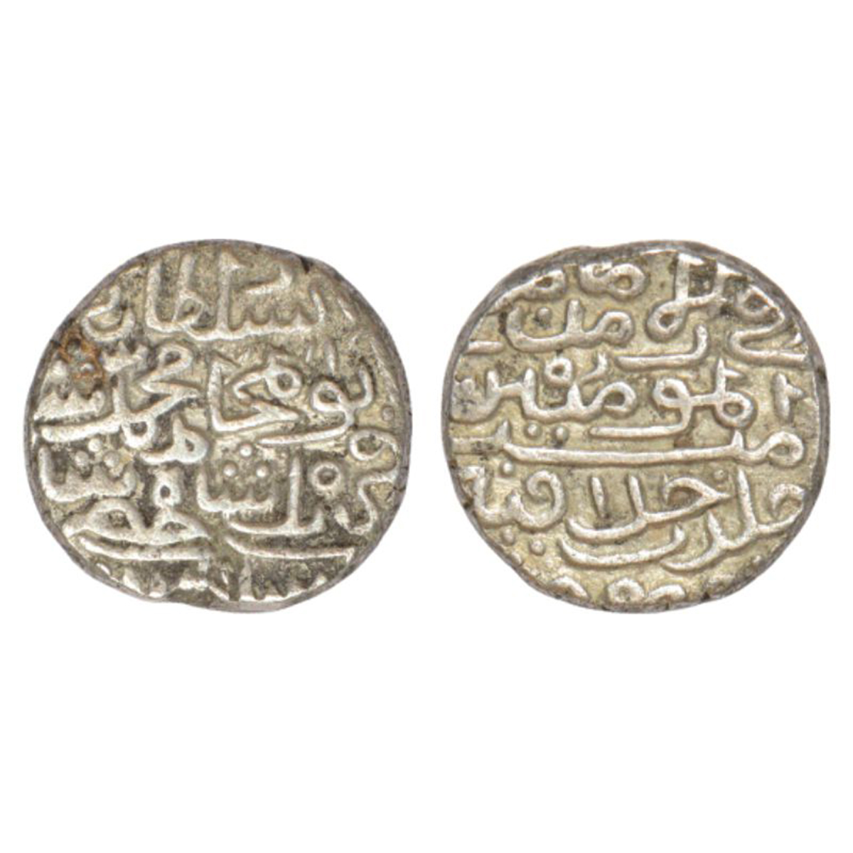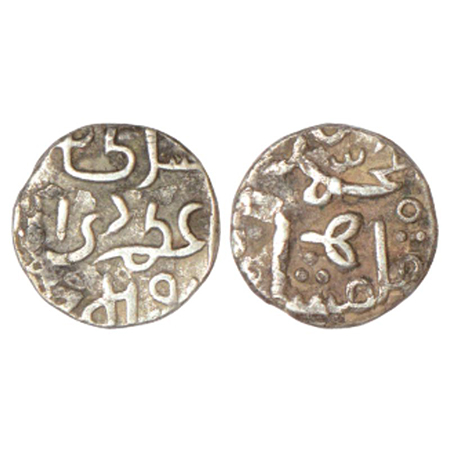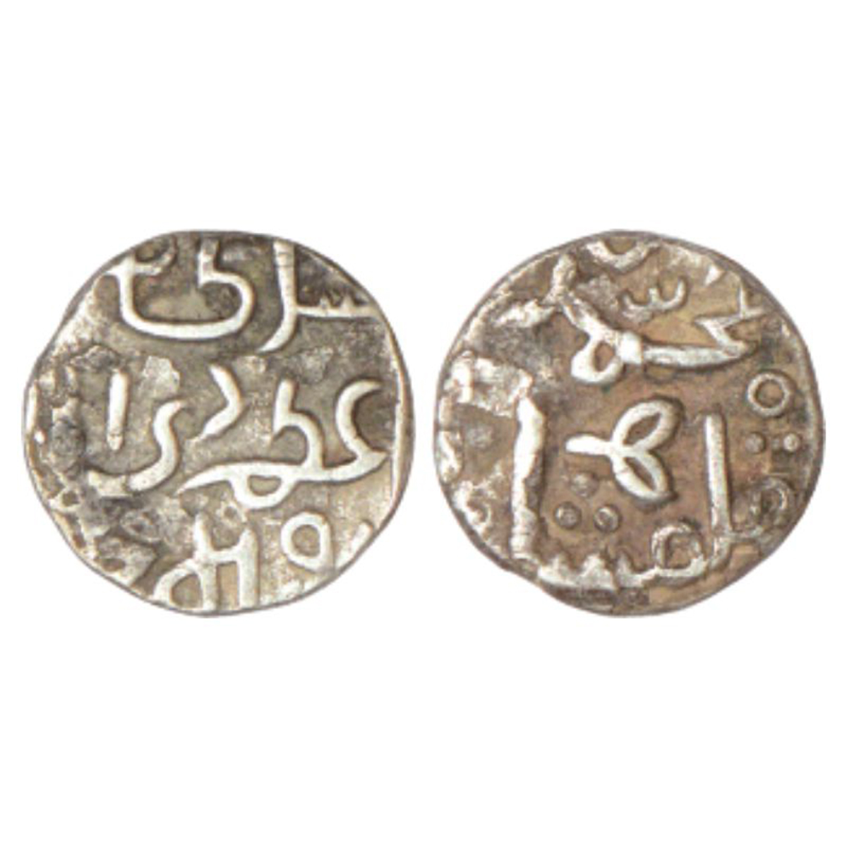 Sultans of Delhi, Tughluqs, silver 1/5th tanka of Muhammad Bin Tughluq (1325-1351 AD), G&G D368 (listed as RR), 1.95g. Obv: Arabic legend al-sultan al-a'zam dhi' al-fath wa al-badhil? (the supreme sultan, endowed with victory and munificence). Rev: Arabic legend muhammad shah bin tughluq shah.