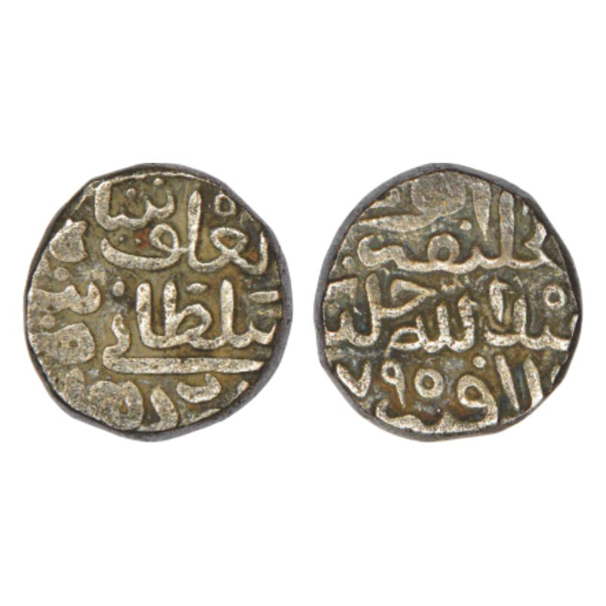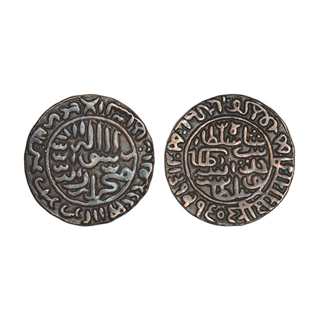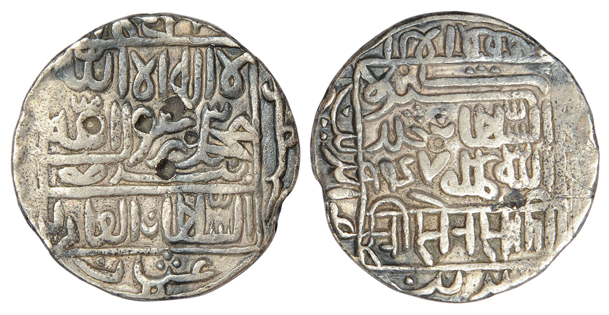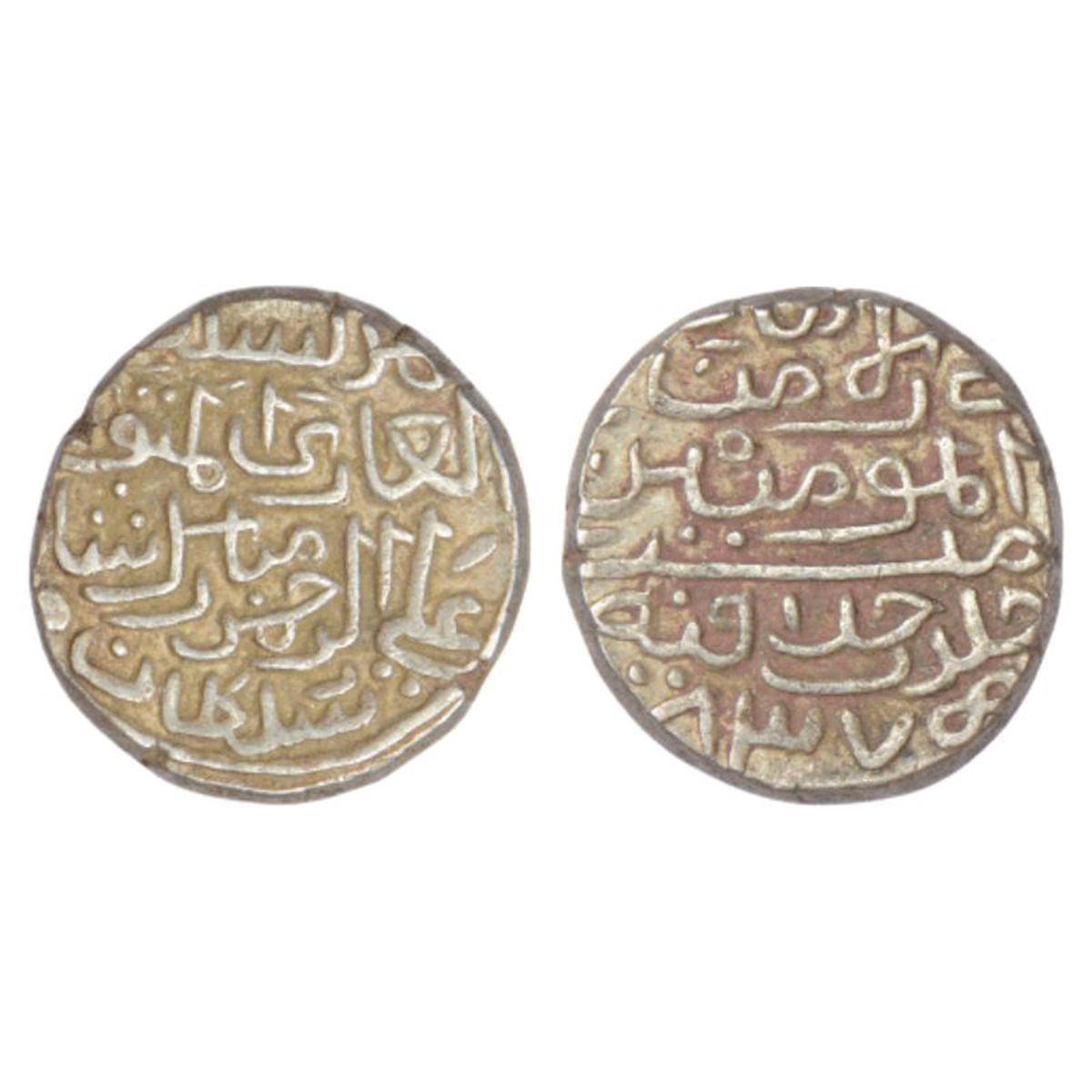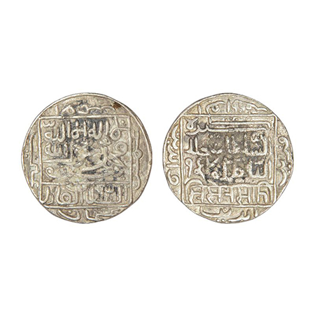Sultans of Delhi, Sayyids, silver tanka of Khidr Khan (1414-1421 AD), struck in the name of Muhammad Bin Firuz of Tughluq, G&G D650, 10.92g. Obv: Arabic legend al sultan al-azam abu-l muhamid muhammad shah bin firuz shah sultani. Rev: Arabic legend fi zaman al-imam amir al-muminin khulidat khilafatahu.