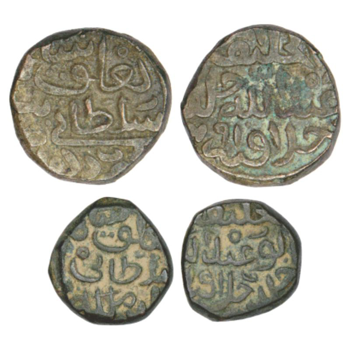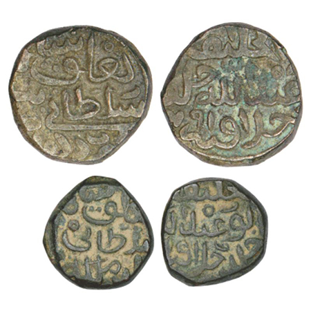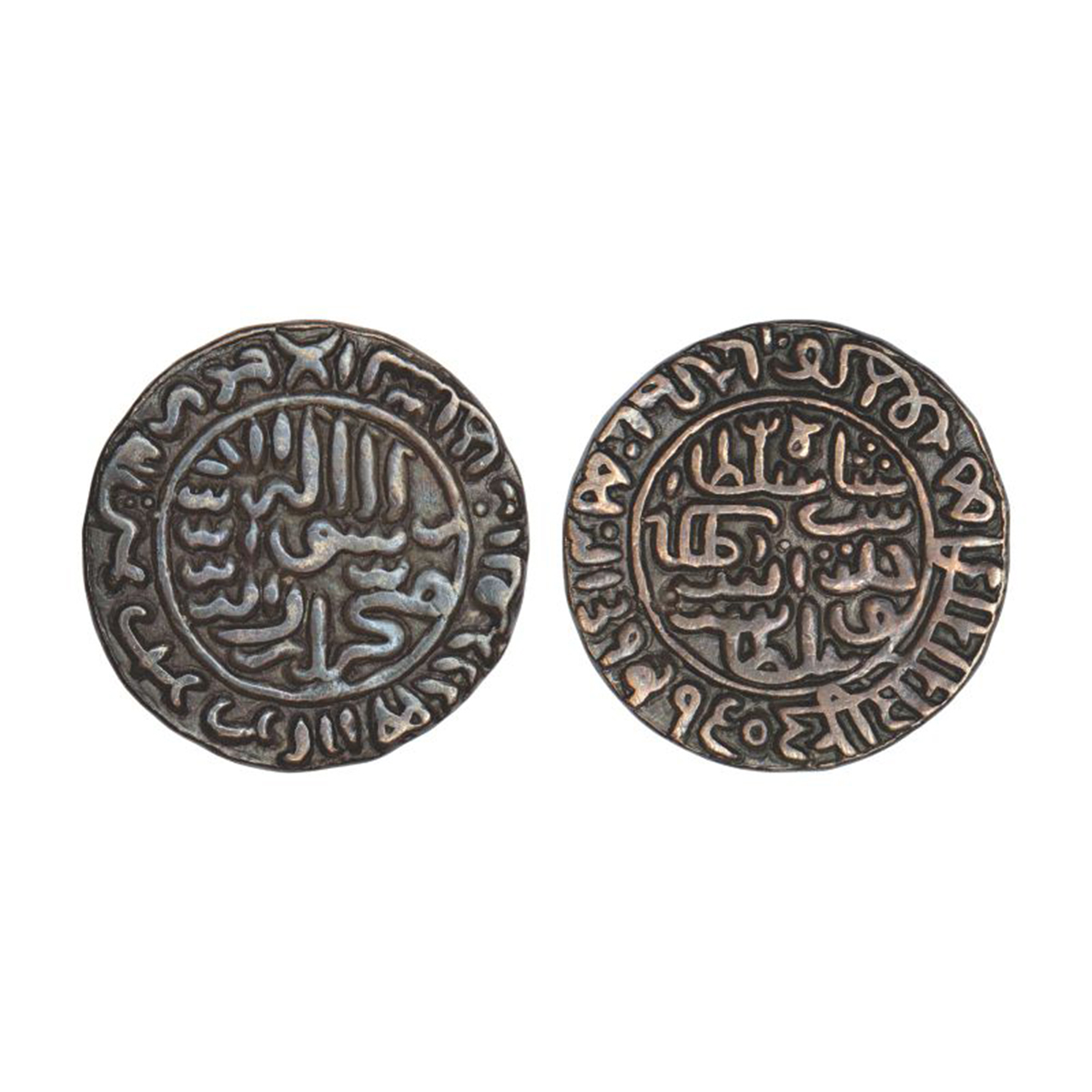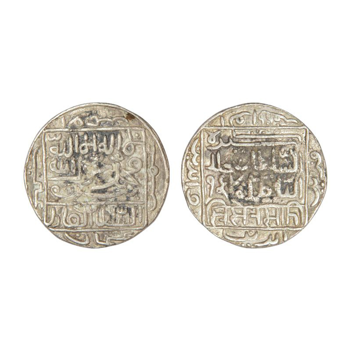 Sultans of Delhi, Tughluqs, two billon fractional coins of Tughluq Shah II (1388-1389 AD), with the name of caliph Abu 'Abd Allah. (A) 5/6th tanka, Delhi mint, AH 791, G&G D532, 9.14g. Obv: Arabic legend tughluq shah sultani durabat bi-hadrat dehli. (B) 1/3rd tanka, G&G D537, 3.64g. Obv: Arabic legend tughluq shah sultani khallada mulkahu. Rev: Arabic legend al -khalifa abu abd allah khulidat khilafatuhu. (2 coins)