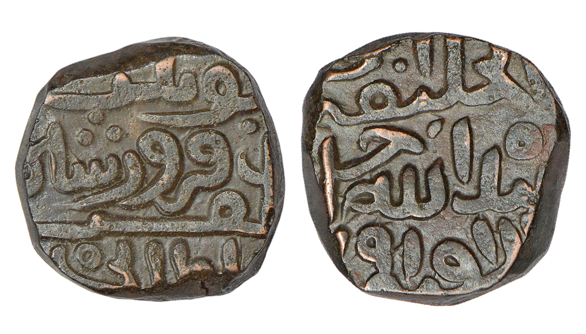 Sultans of Delhi, Tughluqs, billon 5/6th tanka of Tughluq Shah II (1388-1389 AD), Delhi mint, AH 790, G&G D532, 8.92g. Obv: Arabic legend tughluq shah sultani durabat bi-hadrat dehli. Rev: Arabic legend al-khalifa abu abd allah khulidat khilafatuhu and AH date.