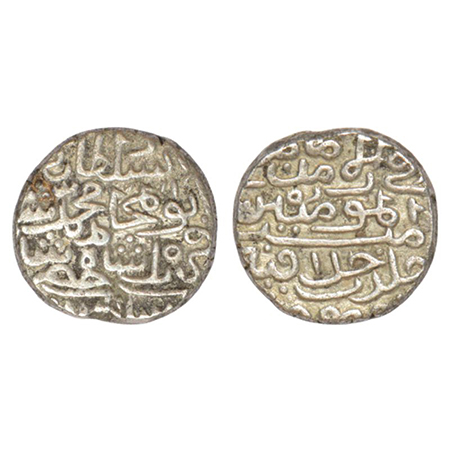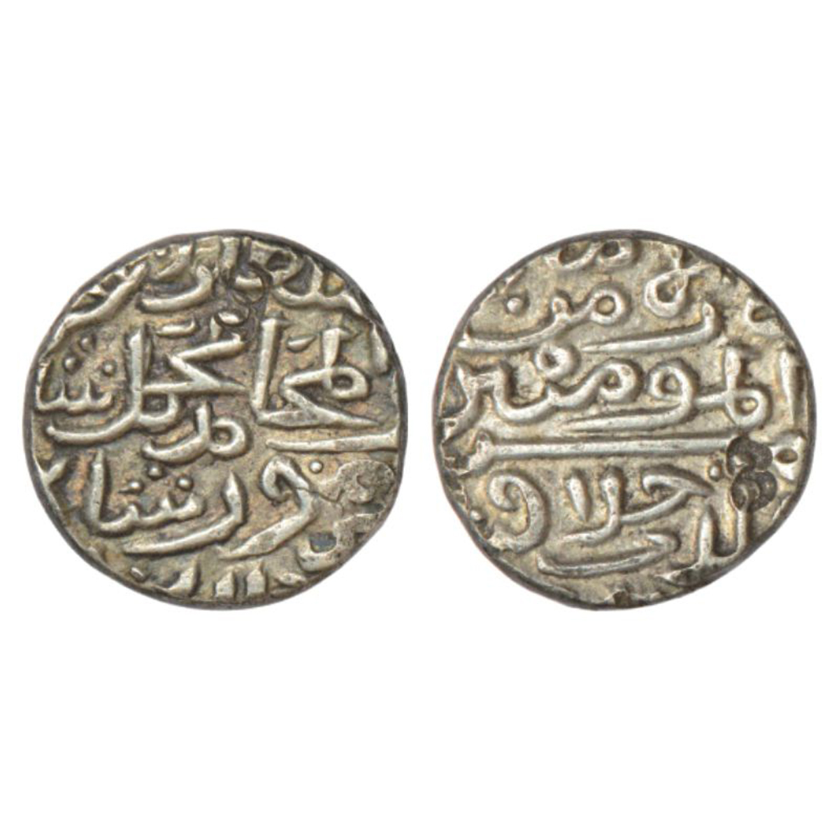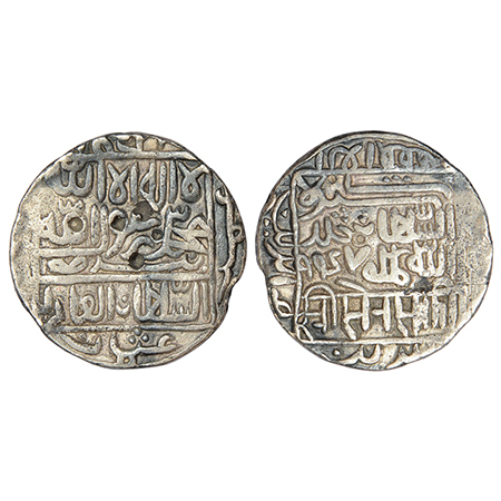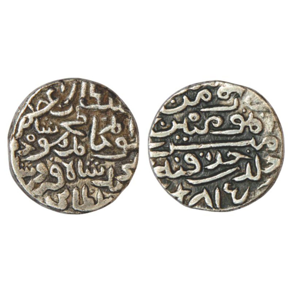 Sultans of Delhi, Sayyids, silver tanka of Muhammad bin Farid (1434-1445 AD), early issue, struck in his own name, AH 84x, G&G D671 (listed as RR), 10.79g. Obv: Arabic legend al-sultan al-'azam abu al-muhamid muhammad shah farid shah hadrat shah al sultan. Rev: Arabic legend fi zaman al-imam amir al-muminin khulidat khilafatahu and AH date in numbers.