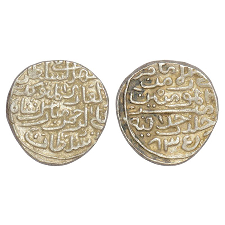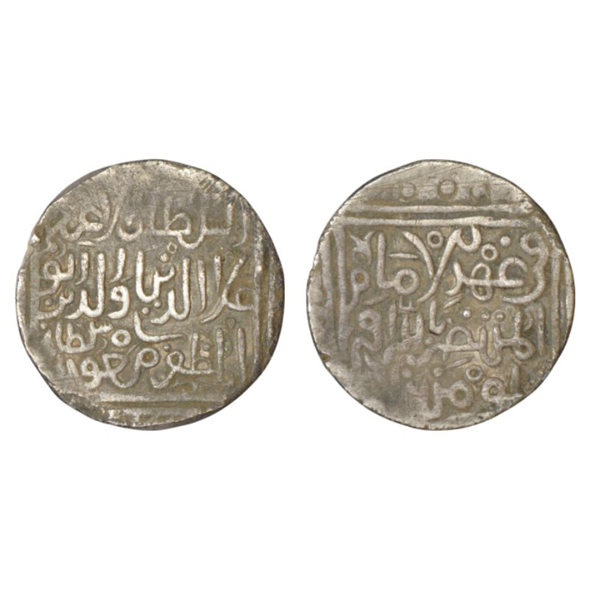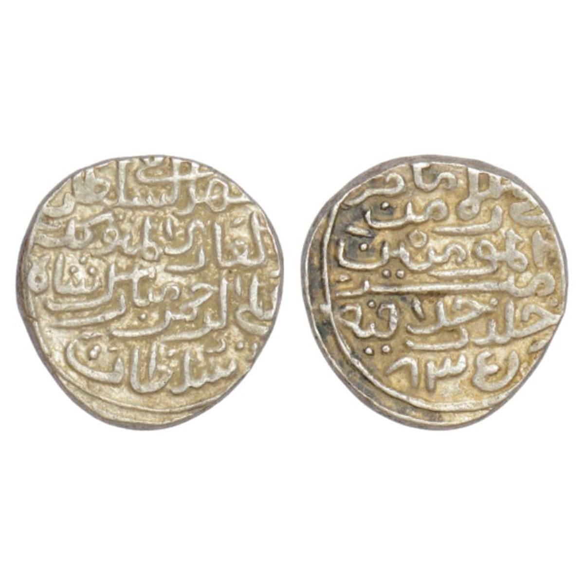 Sultans of Delhi, Sayyids, silver tanka of Mubarak Shah (1421-1434 AD), struck in his own name, AH 835 (fully visible), G&G D660 (listed as RR), 11.30g. Obv: Arabic legend fi ahd al-sultan al-ghazi al mutawakkil 'ala al-rahman mubarak shah al-sultan. Rev: Arabic legend fi zaman al-imam amir al-muminin khulidat khilafatahu and AH date in numbers.