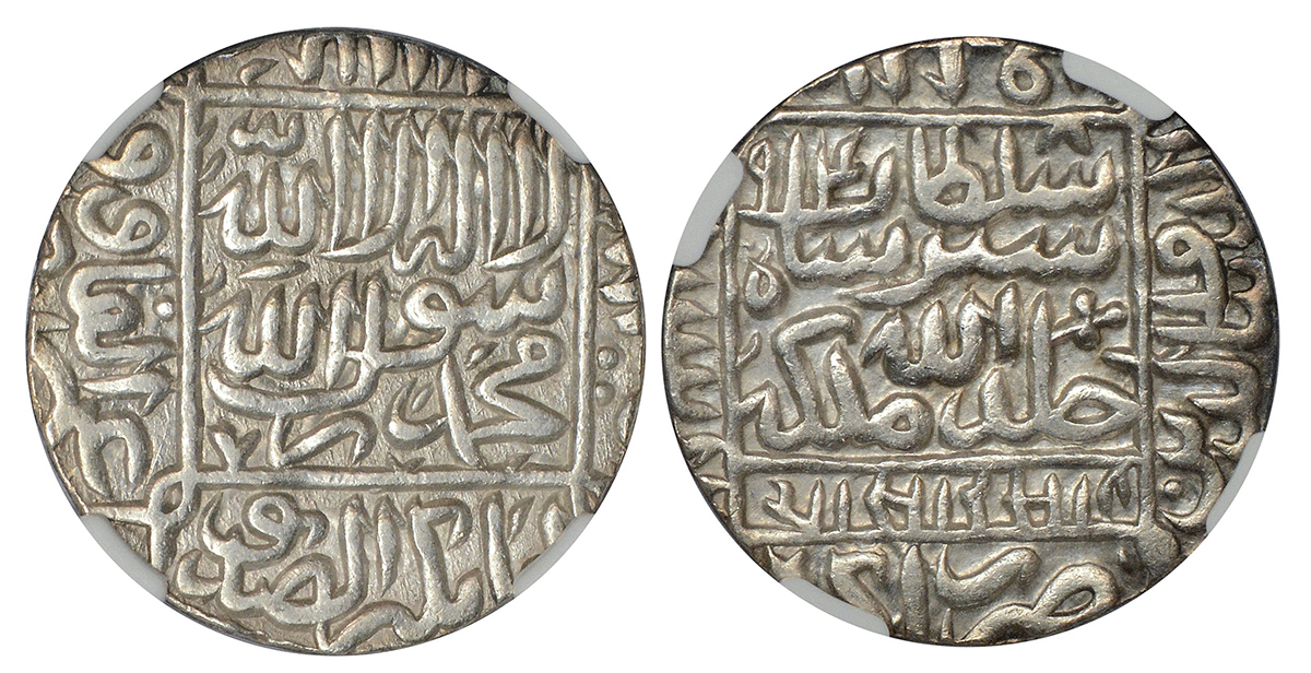 Sultans of Delhi, Suris, silver rupee of Sher Shah (1538-1545 AD), Pandua mint (in Bengal), AH 947, G&G D789 (listed as RR), 11.28g. Obv: Shahada la illah illa allah muhammad rasuluhu allah 'al-sultan al-adil' within square with mint-name pandua in middle; four caliphs name in margin. Rev: Arabic legend sher shah al-sultan khallada allah mulkahu 947 with Devanagari legend Sri Serasahi in square; Arabic legend farid al dunya wa'l din abu'l muzaffar in the margins.