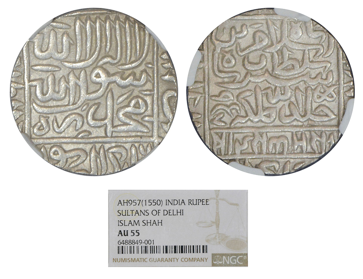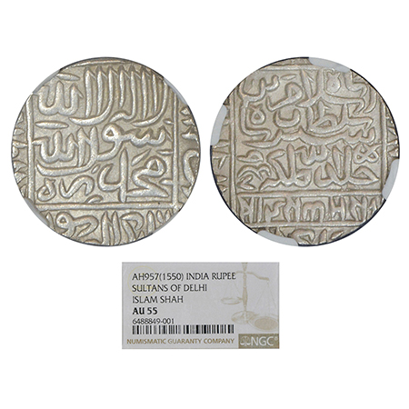 Sultans of Delhi, Suris, silver rupee of Islam Shah (1538-1545 AD), Agra mint, AH 957, G&G D955. Obv: Shahada in rectangular border, names of Rashidoons and their titles around. Rev: In rectangular border Arabic legend islam shah bin sher shah sultan khallada allah mulkahu, with AH date and Devanagari legend Sri Isalamasahi in a compartment; other titles around, mint-name in the bottom margin.
