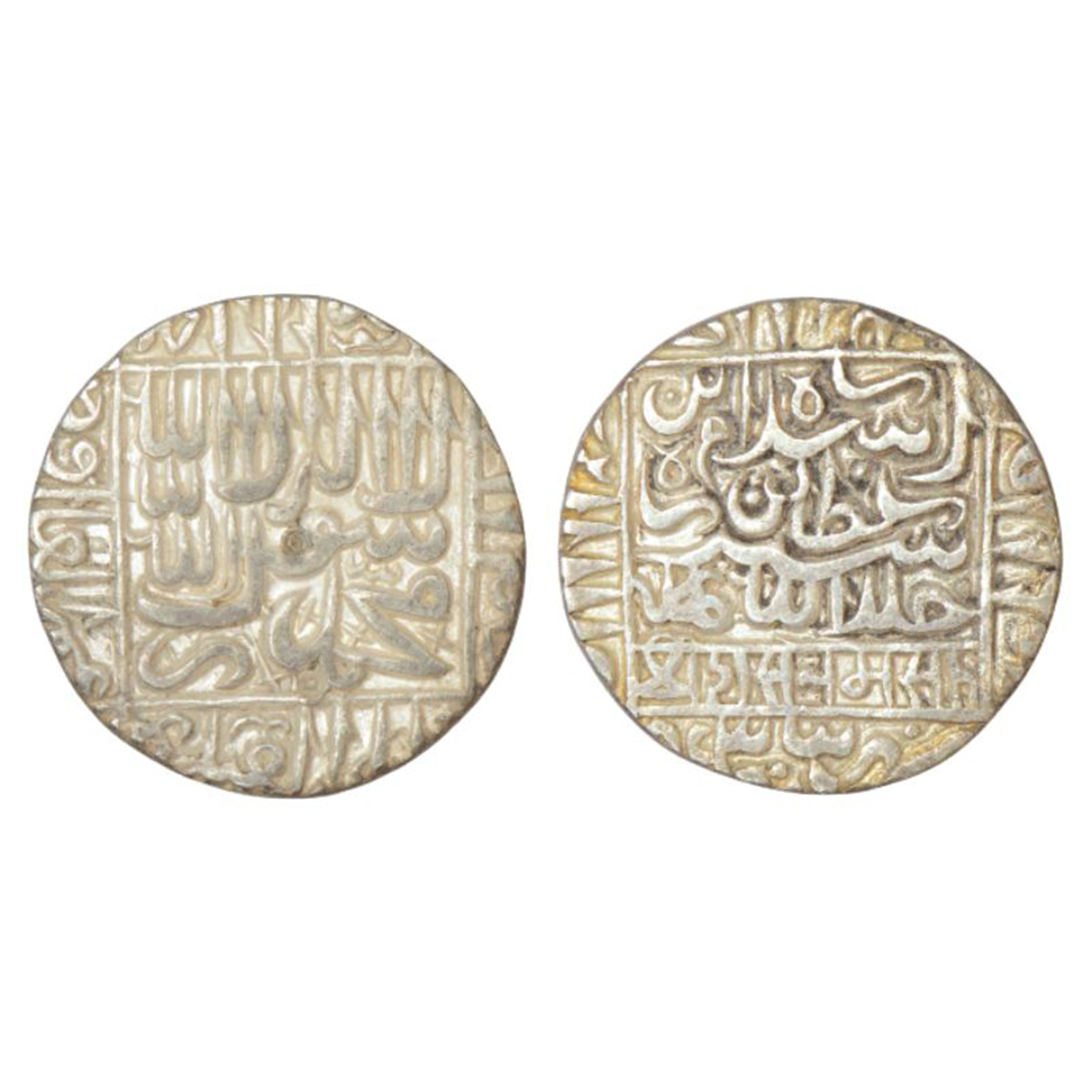 Sultans of Delhi, Suris, silver rupee of Sher Shah (1538-1545 AD), Pandua mint (in Bengal), AH 947, G&G D789 (listed as RR), 11.28g. Obv: Shahada la illah illa allah muhammad rasuluhu allah 'al-sultan al-adil' within square with mint-name pandua in middle; four caliphs name in margin. Rev: Arabic legend sher shah al-sultan khallada allah mulkahu 947 with Devanagari legend Sri Serasahi in square; Arabic legend farid al dunya wa'l din abu'l muzaffar in the margins.