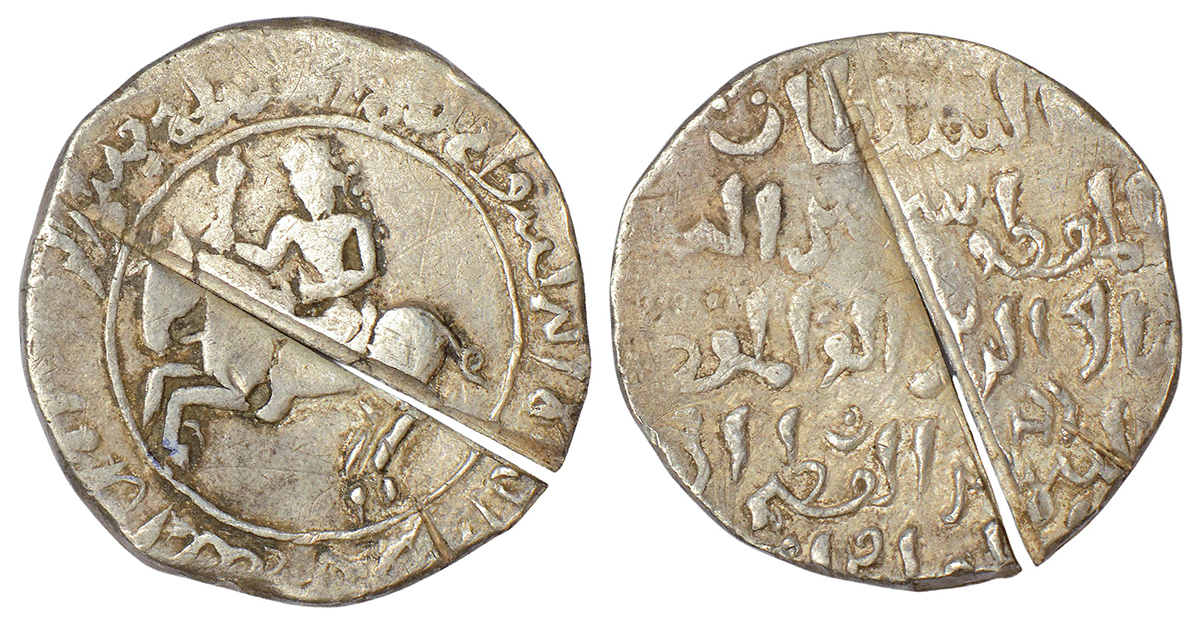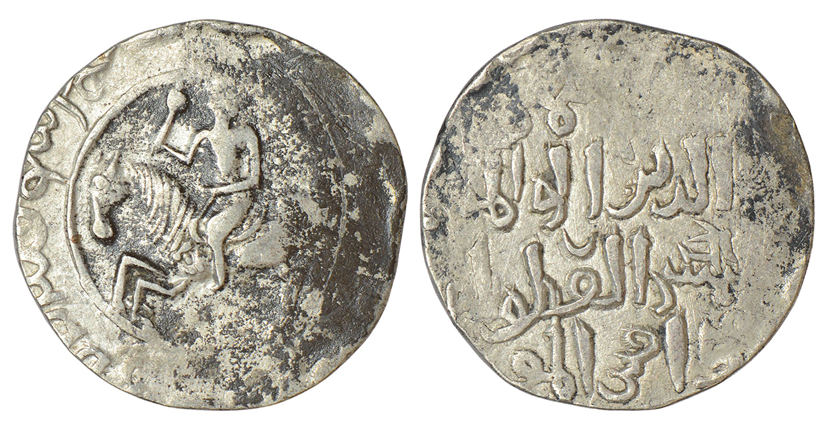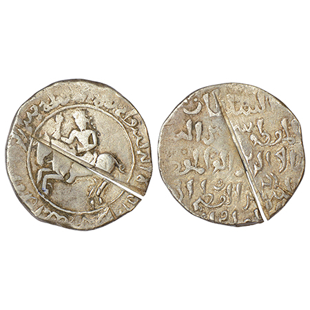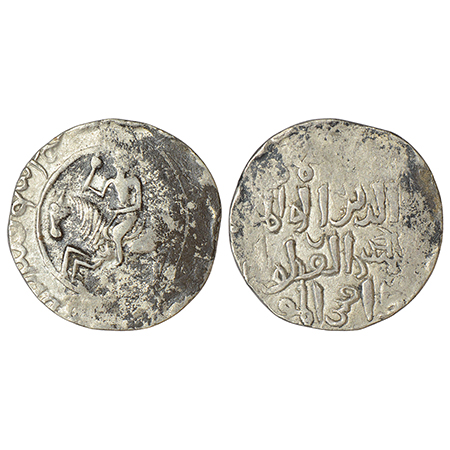 Sultans of Bengal, Silver tanka of Ghiyath al-Din 'Iwad (1217-1220 AD), in the name of Shams al-Din Iltutmish, Sultan of Delhi (1210-1235 AD), 'Horseman' type, G&G B18, 10.70g. Obv: Horseman to left holding a mace, in circle; Kalima and Arabic legend in margin. Rev: Arabic legend al-sultan al-mu'azzam shams al-dunya wa al din iltutmish al-qutbi al-sultan; Devanagari letter 'Shri' above Iltutmish.