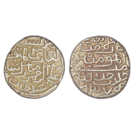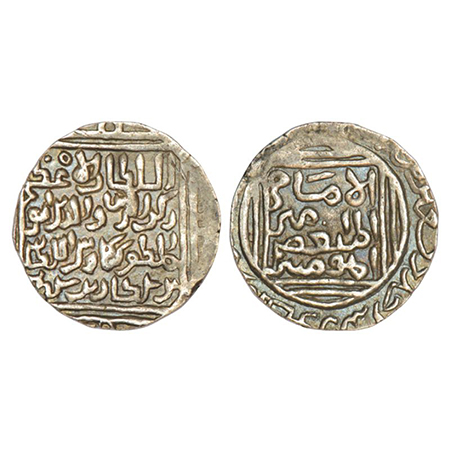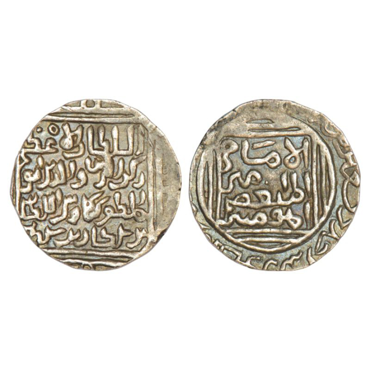 Sultans of Delhi, Turks, silver ½ tanka of Shams al-Din Iltutmish (1210-1235 AD), citing Caliph al-Mustansir, G&G D39A (new reference given by Paul Stevens in his database), 5.43g. Obv: Arabic legend al-sultān al-'azam shams al-duniyā wa al-din abu al-muzaffar iltutmish al-sultān in double rectangles. Rev: Shahada followed by Arabic legend al-mustansir billah amir al-mumineen in double rectangles.