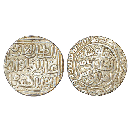 Sultans of Delhi, Tughluqs, silver tanka of Ghiyath al-Din Tughluq (1320-1325 AD), Qila Deogir mint, AH 721, mint and date clearly visible, G&G D307, 10.87g. Obv: Arabic legend al-sultan al-ghazi ghiyath al-dunya wa'l din abu'l muzzafar within double square. Rev: In circle, Arabic legend tughluq shah al-sultan nasir amir al mu'minin; date and mint details in the margin.