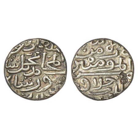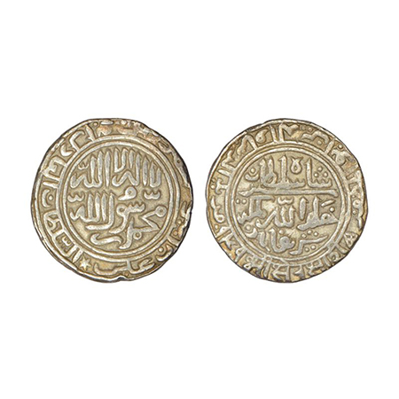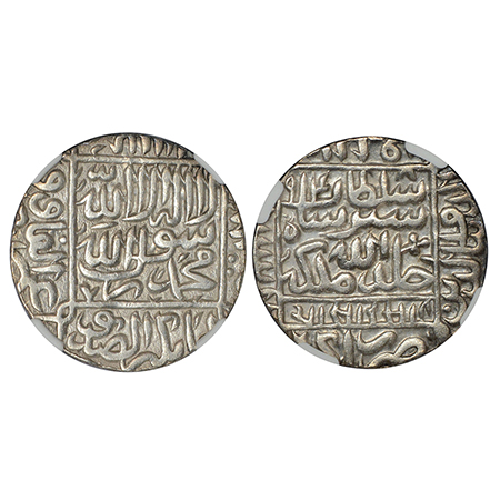 Sultans of Delhi (issued in Bengal), silver tanka of Muhammad bin Tughluq (1326-1335 AD), 'al-Mujahid' type, Shahr Lakhnauti mint, G&G B123, 11.02g. Obv: Arabic legend al-mujahid fi-sabil allah muhammad bin tughlaq shah; four Caliphs name around. Rev: Shahada in centre; mint-name and other details in margins.