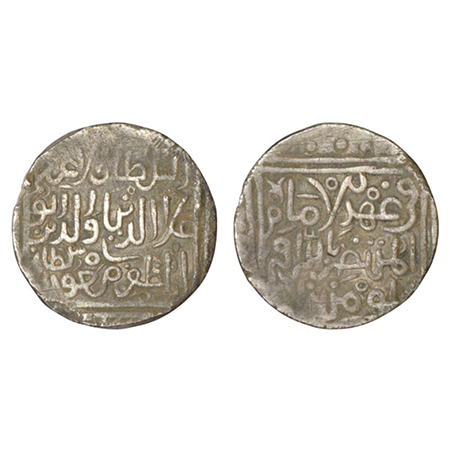 Sultans of Delhi, Sayyids, silver tanka of Mubarak Shah (1421-1434 AD), struck in his own name, AH 837 (fully visible), G&G D660 (listed as RR), 11.23g. Obv: Arabic legend fi ahd al-sultan al-ghazi al mutawakkil 'ala al-rahman mubarak shah al-sultan. Rev: Arabic legend fi zaman al-imam amir al-muminin khulidat khilafatahu and AH date in numbers.