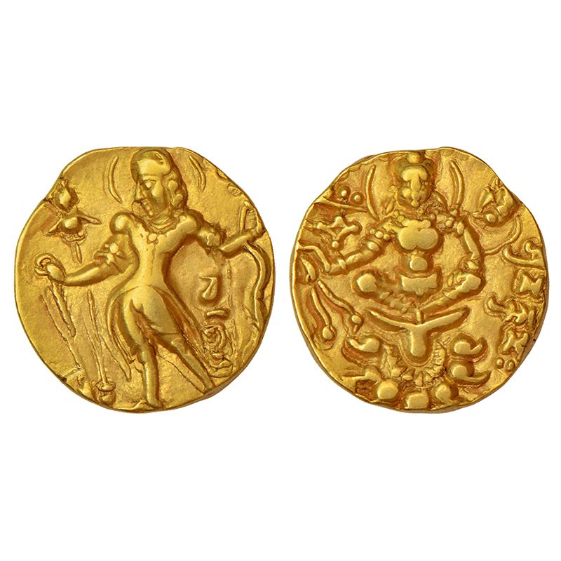 Gupta Empire - gold dinar of Chandragupta II (c.375-415 AD), 'Archer-Goddess on Lotus' type, S. Kumar Class III, var. A, 18.50mm; 7.81g. Obv: Nimbate king standing facing left, wearing Kushan style tunic over loin cloth, holding strung bow in left hand and arrow pointing downwards in right, Garuda standard in backdrop; Brahmi legend Chandra below left arm. Rev: Goddess Lakshmi with halo, seated cross-legged on a lotus in padmasana posture, holding long-stemmed lotus flower in left hand resting on knee and diadem in right hand; Brahmi legend Shri Vikkramah to right and tamgha in left field.