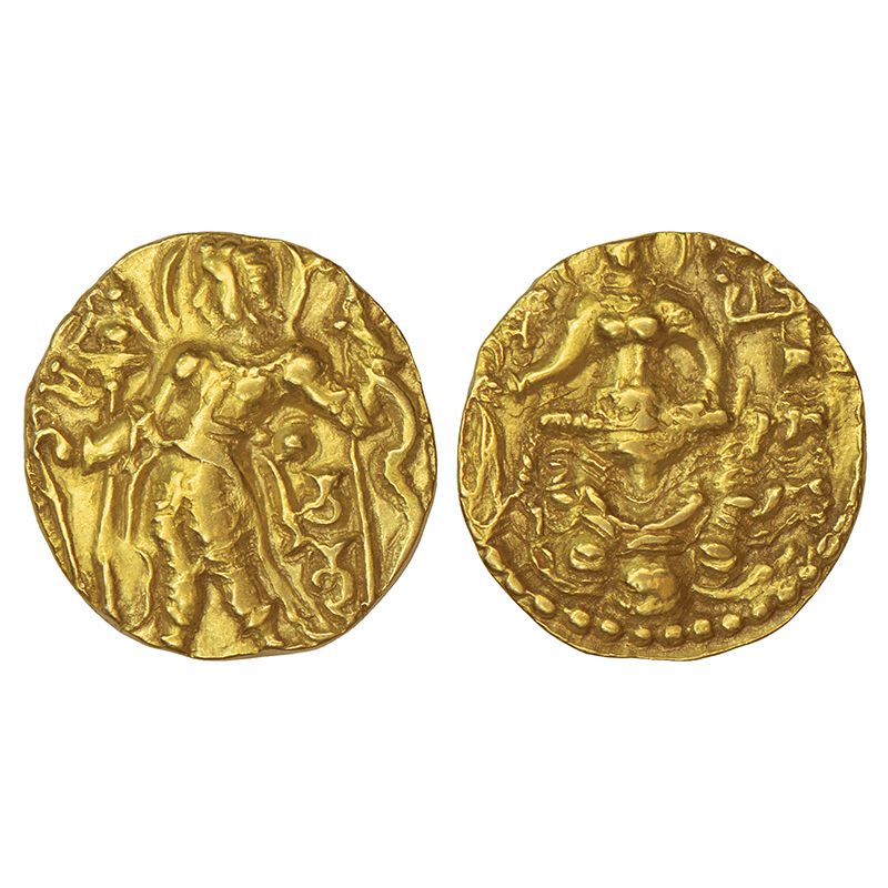 Gupta Empire, gold dinar of Chandragupta II (c.375-415 AD), 'Archer-Goddess on Lotus' type, S. Kumar Class III, var. A.4, 18.23mm; 8.13g. Obv: Nimbate king standing facing left in tribhanga posture, hair braided, wearing Kushan style tunic, and jewelled armbands, holding a strung bow in his left hand with Brahmi legend Chandra below, and an arrow pointing downward in his right hand, with Garuda standard to left. Rev: Goddess Lakshmi with halo, seated cross-legged on a lotus in padmasana posture, holding a diadem in her right hand, and a long-stemmed lotus flower in her left hand; Brahmi legend Shri Vikramah to right and tamgha in left field, dotted border around.