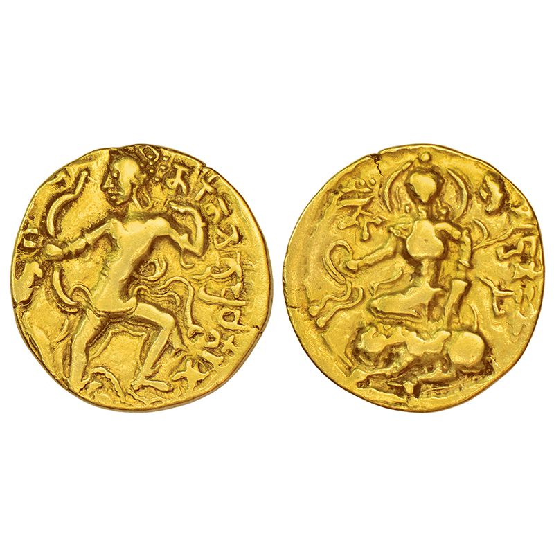 Gupta Empire - gold dinar of Chandragupta II (c.375-415 AD), 'Lion Slayer' type, Altekar Class I (lion combatant), Var. A; S. Kumar Class III, variety B.3.5 (RRR), struck from the same dies as S. Kumar Coin no. 493, preserved in the British Museum, 19.40mm; 7.75g. Obv: King wearing moustache, ornate crown, dhoti and a sash tied at the waist, with large earring, turned to left with one leg flexed upwards at the knee, drawing the bow and firing an arrow at the lion falling backwards to the left; Brahmi legend Narendrachandrah Prathitarano (rane jayatyajayyo bhuvi simhavikramah) from 1 o'clock along the margin. Rev: Nimbate Goddess Lakshmi, seated in a Vamardhaparyankasana posture (with one leg folded and the other drawn up), facing front on lion reclining to left; holding a long-stemmed lotus in one hand and a noose in the other; Brahmi legend Simhavikramah to right and tamgha in the left field.