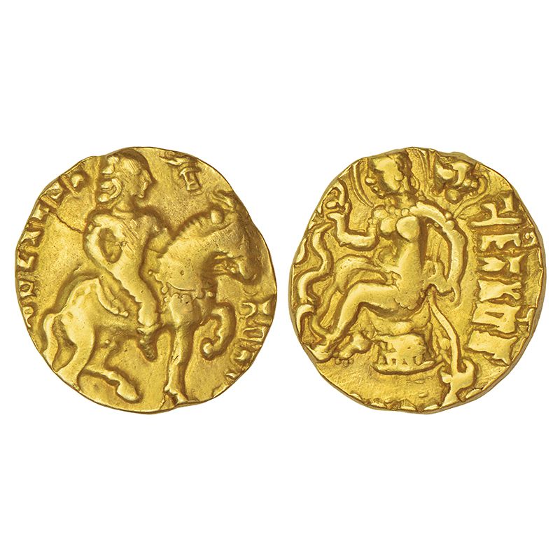 Gupta Empire, gold dinar of Kumara Gupta I (c.415-450 AD), 'Horseman' type, Altekar Class I, var. C; S. Kumar Class I, variety C.1, similar to S. Kumar coin 657, 17.57mm; 8.15g. Obv: King riding caparisoned horse cantering to right, bare -chested, wearing dhoti, armbands, and jeweled necklace, horse with jeweled braided mane; Brahmi legend Kshitipatirajito vijayi Kumaragupto divam jayati [The unconquered and victorious King Kumaragupta wins the heavens], visible in parts from 12 o'clock along the margin. Rev: Nimbate Goddess Lakshmi seated in profile, facing left, on a decorative wicker stool, wearing a pearled necklace and large earrings, holding a long stemmed lotus with root nodules at the base in her left hand and a diadem in her right hand; Brahmi legend Ajitamahendra [invincible Mahendra - an epithet of God Indra, the king of gods] in the right field.