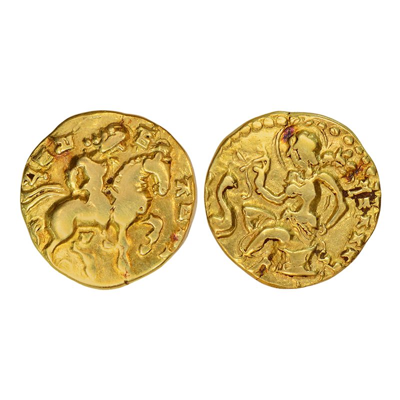 Gupta Empire - gold dinar of Kumara Gupta I (c.415-450 AD), 'Horseman' type, S. Kumar Class III, Var. C, 7.96g. Obv: King riding caparisoned horse cantering to right, bare-chested, wearing dhoti; Brahmi legend Kshitiparajito Vijayi Kumaragupto divam jayati [The unconquered and victorious King Kumaragupta wins the heavens] visible in parts around. Rev: Nimbate Goddess Lakshmi seated on a decorative wicker stool, in profile facing left, wearing necklace and earrings, holding long-stemmed lotus in her left hand and feeding grapes to a peacock with the other; Brahmi legend Ajitamahendra [invincible Mahendra - an epithet of God Indra, the king of gods] to right; dotted border around.