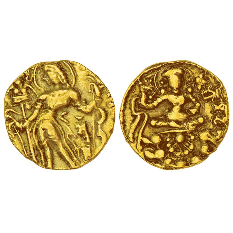 Gupta Empire - gold heavy dinar of Skanda Gupta (c.455-470 AD), 'Archer' type, S. Kumar Class II, var. A, 20.33mm; 9.06g. Obv: Nimbate king standing facing left, wearing a tunic, holding a strung bow in one hand and an arrow in the other; with a 'Garuda' standard to his left, Brahmi legend Skanda below the king's elbow with a small crescent above; traces of Brahmi legend around. Rev: Nimbate goddess Lakshmi seated cross-legged on a lotus in padmasana, holding lotus in her left hand and a diadem in her right hand; with Brahmi legend Kkramādityah to right and a tamgha in the left field.