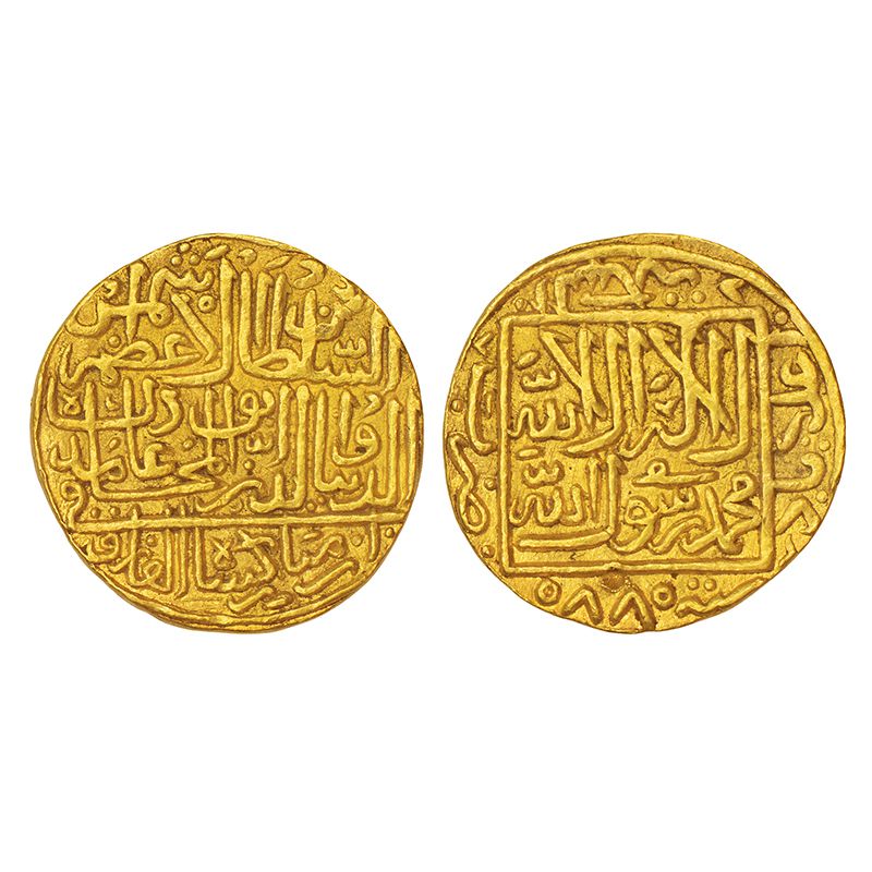 Akbar (1556-1605 AD), gold mohur, Dar ul-Khilafat Agra mint, AH 980, KM 106.1, 20.72mm, 10.78g. Obv...