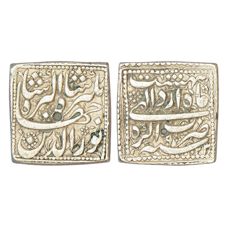 Jahangir (1605-1627 AD), silver square rupee, Agra mint, Ardibihist month, AH 1023/RY 9, KM 147.2, 11.39g. Obv: Persian legend Nur-ud-din Jahangir Shah Akbar Shah. Rev: Mint name, Ilahi month, date and RY; both sides legend in double pellets square.