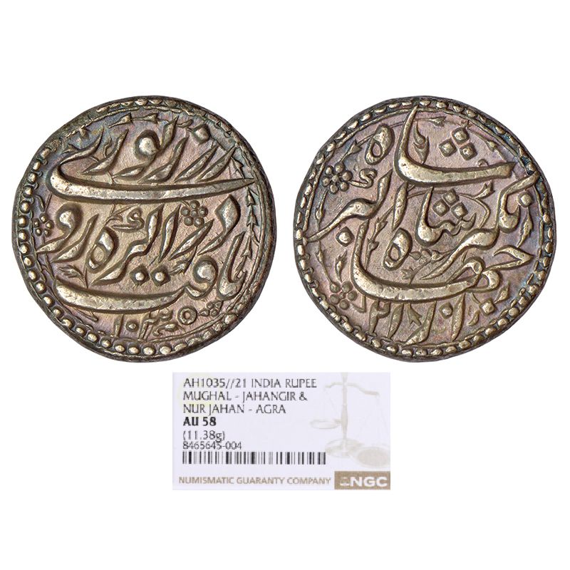 Jahangir (1605-1627 AD), silver rupee, Agra mint, 'Yaft' couplet, AH 1035/RY 21, KM 149.1 but legend differently arranged, with the word 'Akbar' placed at left on reverse rather than its usual position at top, 21.63mm, 11.38g. Obv: Farsi hemistich Rooye Zar Zewar yaft dar Agrah with AH date below. Rev: Farsi hemistich az Jahangir Shah Akbar Shah ( "the face of gold was given light in Agra, by king Jahangir (the son of) king Akbar") with RY below.