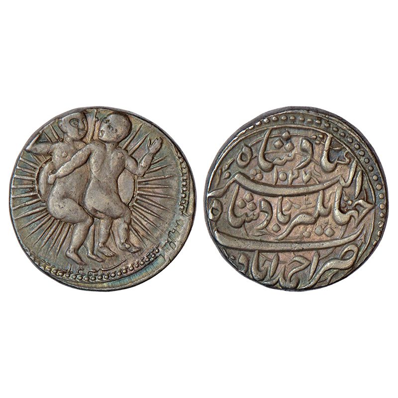 Jahangir (1605-1627 AD), silver 'Zodiacal' rupee, Ahmadabad mint, 'Gemini' sign (Khurdad month), AH 1027/RY 13, KM 150.7, 11.35g. Obv: Zodiac Sign of Gemini: the twins Castor & Pollux in a dance against a sun-burst backdrop with RY date below. Rev: Farsi inscription Jahangir Badshah Akbar Badshah with mint-name and AH date.