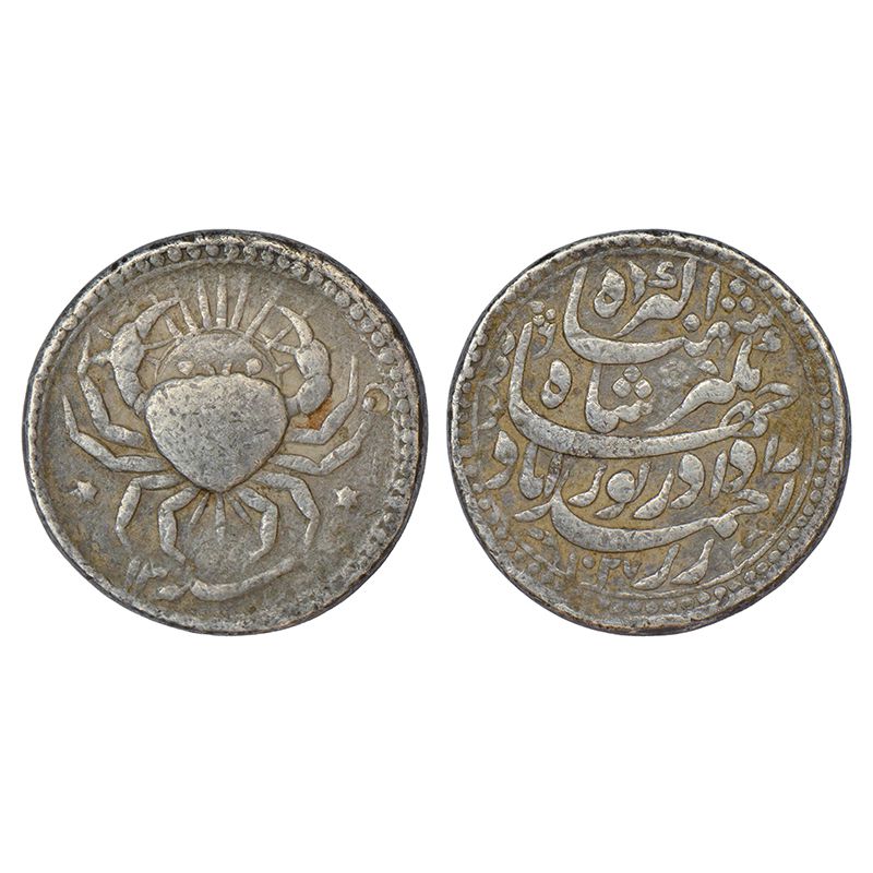Jahangir (1605-1627 AD), silver 'Zodiacal' rupee, Ahmadabad mint, 'Cancer' sign (Tir month), AH 1027/RY 13, KM 150.10, 11.33g. Obv: Zodiac sign of Cancer the Crab - Constellation of Karkata, half sunburst between its claws; stars flanking lower legs with RY date below. Rev: Farsi couplet Zar ra Ahmadabad Dad Zewar Jahangir Shah Shahanshah Akbar (Gold was made into a jewel at Ahmadabad by King of Kings Jahangir (the son of) King Akbar) with AH date.