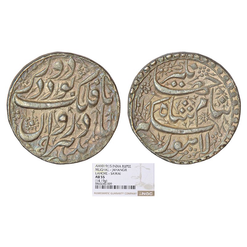 Jahangir (1605-1627 AD), silver 'Sawai' rupee (25% heavy weight), Lahore mint, 'Ta-Falak' couplet, AH 1019/RY 5, KM 158.5, Zeno #24335, 14.19g. Obv: Farsi hemistich badhar bad rawaan ta falak buwad dar dur (In the World been current, will be till Heaven in the times) with RY date. Rev: Farsi hemistich Ba naame Shahe Jahangir Sikka-e-Lahore (by the name of Shah Jahangir, [this] coin of Lahore). The couplet means - This coin, having been current in the world, will be till Heavens, by the name of King Jahangir.