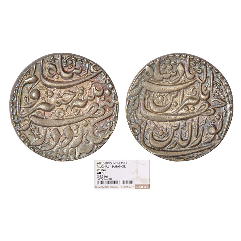 Jahangir (1605-1627 AD), silver square 'Sawai' rupee (25% heavy weight), Patna mint, 'Khusru-e-Alam Panah' couplet, AH 1019/RY 5, Liddle Jahangir S-97, KM 158.6, 14.31g. Obv: Farsi hemistich sikka-e-zad dar shahr patna, Khusru-e-alam panah (Struck coin in the city of Patna, the chosroes, the refuge of the universe) with AH date. Rev: Farsi hemistich shahe noor-ud din Jahangir, son of Akbar badshah and RY date.