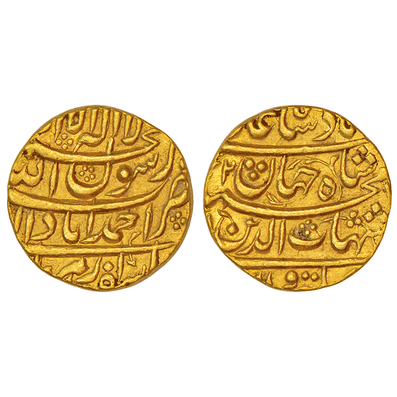 Shah Jahan (1628-1658 AD), gold mohur, Ahmadabad mint, Isfandarmuz (Pisces) month, AH (10)42, both sides legend in four lines, KM 255.1, 10.92g. Obv: The Kalima Shahada, Mint-name and Ilahi month at bottom. Rev: Emperor's full name and title sahib-e-qiran sani shihab ud-din muhammad shahjahan badshah ghazi with AH date.