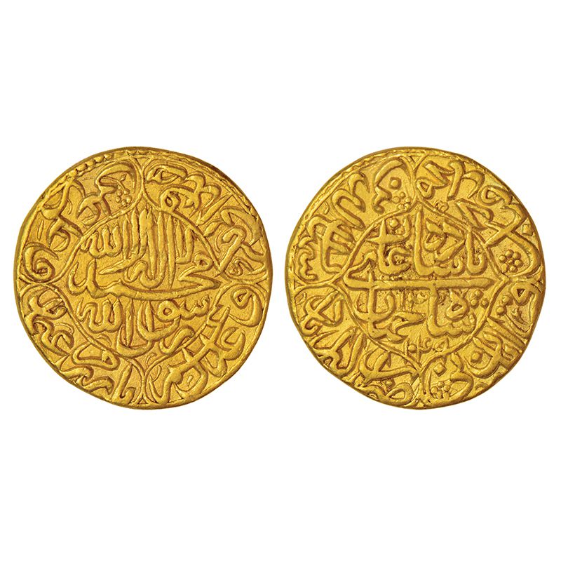 Shah Jahan (1628-1658 AD), gold mohur, Akbarabad mint, AH 1049/RY 13, KM 258.1, 23.02mm, 10.81g. Obv: Kalima within quatrefoil with names of four Rashidoon caliphs and their titles - bi-sudq abu bakar, wa adil umar, bi-azram uthman and wa ailm 'Ali in the margin. Rev: Persian legend Shah Jahan Badshah Ghazi with AH date and RY within quatrefoil; ruler's title & mint name in the margin.