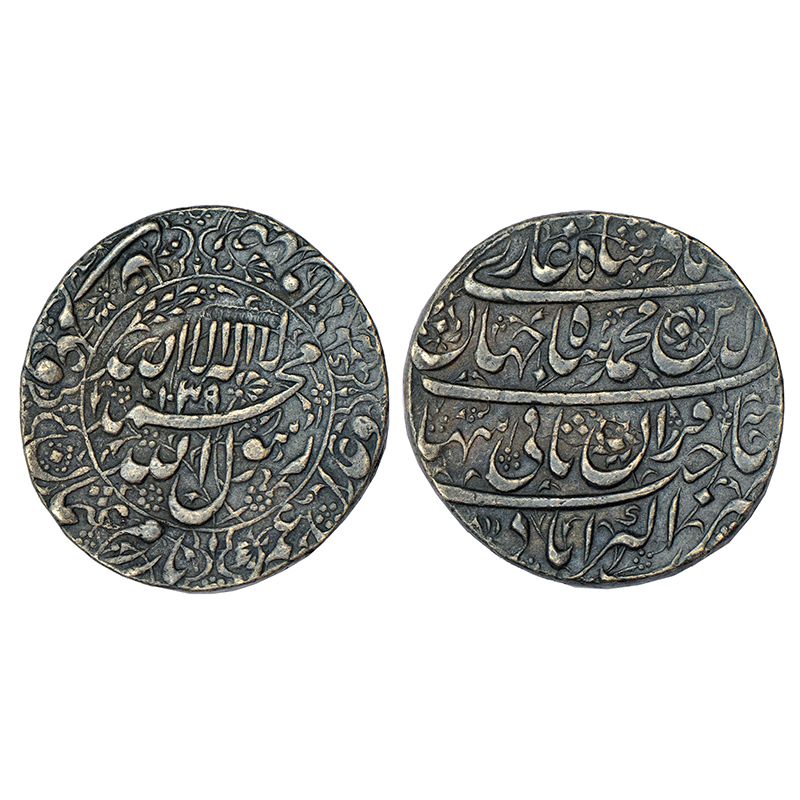 Shah Jahan (1627-1658 AD) - silver 'Nazarana' rupee, 'Shahada X 4-line legend' type, Akbarabad mint, AH 1039/RY 2/3, 25.50mm, 11.33g. Obv: Shahada in circle with AH date in centre and names and titles of Rashidoon caliphs bi-sudq abu bakar, wa adil umar, bi-azram uthman and wa ailm 'Ali in decorative cartouches around. Rev: full name of the emperor Sahib Qiran Thāni Shihab al-Din Muhammad Shahjahan Badshah Ghazi with mint name at the bottom.