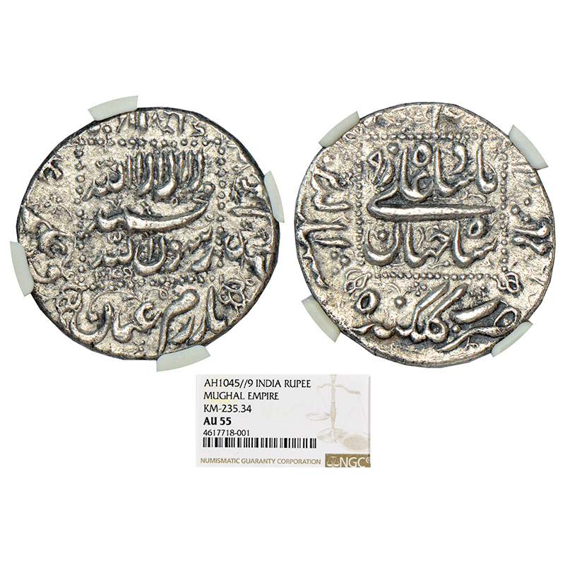 Shah Jahan (1627-1658 AD) - silver rupee, Golkonda mint (fully visible), 'square areas' type, AH 1045/RY 9, KM 235.34. Obv: Shahada in dotted square with names and titles of Rashidoon caliphs in margins. Rev: in dotted square, Shahjahan Badshah Ghazi with other portions of his name in left, top and right quadrants. Mint name in bottom quadrant.
