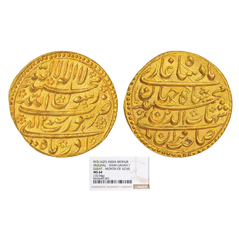 Shah Jahan (1628-1658 AD), gold mohur, Surat mint, Azar (Sagittarius) month, RY 2, both sides legend in four lines, KM 255.6, 10.94g. Obv: The Kalima Shahada, Mint-name, RY date with Ilahi month at bottom. Rev: Emperor's full name and title sahib-e-qiran sani shihab ud-din muhammad shahjahan badshah ghazi.