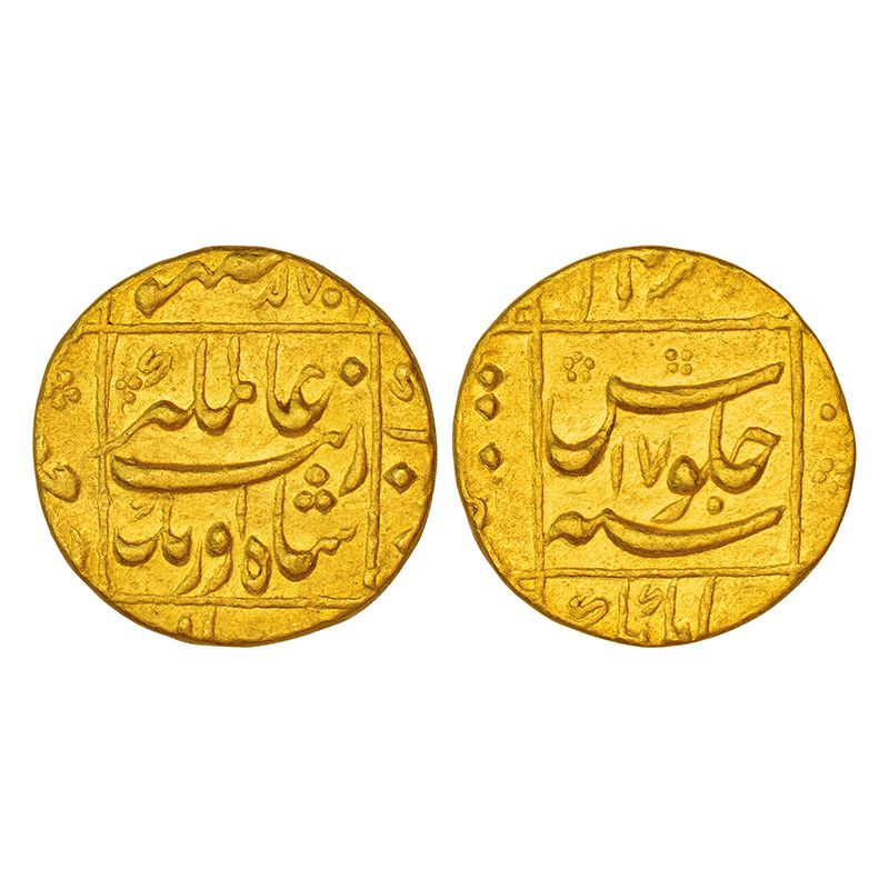 Aurangzeb (1658-1707 AD), gold mohur, Jahangirnagar mint, 'Mihr-e-munir' couplet, AH 1084/RY 17, KM 323.1, Zeno#142213 (same coin), 10.96g. Obv: Persian legend Shah Aurangzeb Alamgir within square. Rev: RY date within square and mint-name in bottom quadrant.