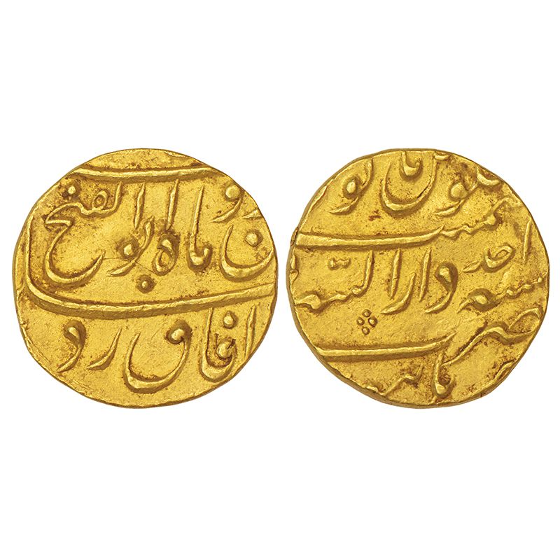 Jahandar Shah (1712-1713 AD), gold mohur, Dar us-Sarur Burhanpur mint, 'Abu ul-Fath' couplet, RY Ahd, KM 368.2, 11.00g. Obv: Persian legend dar aafaq zad sikka chun mehr-o-mah, abu ul-fath (ghazi jahandar shah). Rev: Mint-name, RY and Jalus formula.