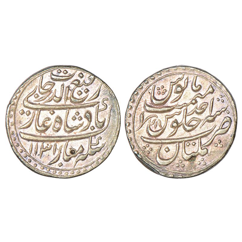 Rafi ud-Darjat (1719 AD), silver rupee, Multan mint, AH 1131/RY Ahd, KM 405.15, Zeno #148029 (same coin), 11.48g. Obv: Persian legend sikka mubarak badhshah ghazi Rafi-ud-darjat and AH date. Rev: Mint-name, RY and Jalus formula.